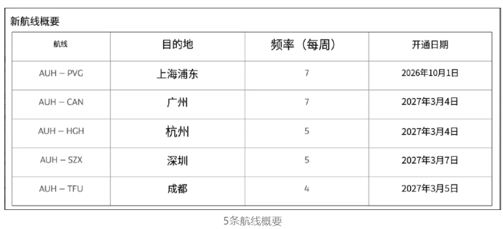 此外,上海至阿布扎比航线则将于2026年10月1日开通,每日一班,是新增航线中最早开通的一条。