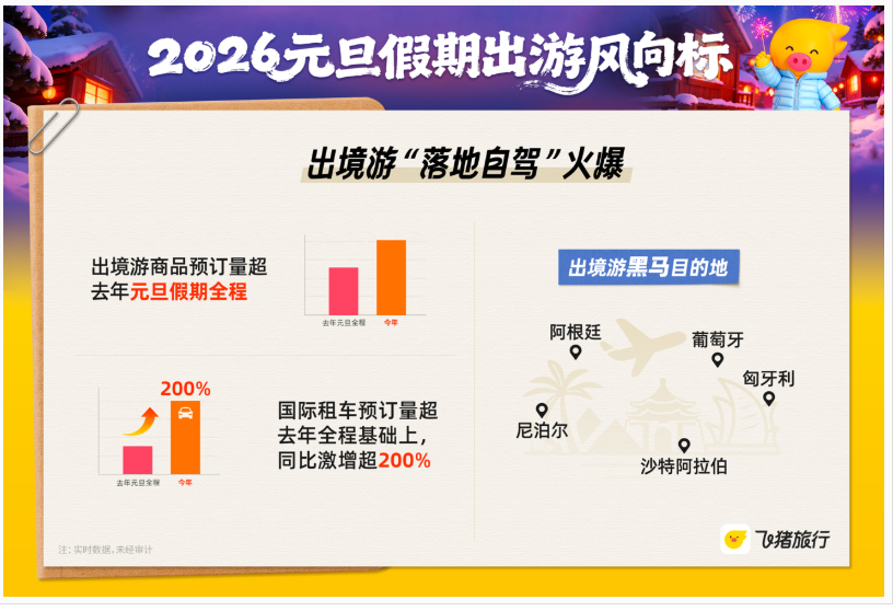 12月19日,飞猪发布的《2026元旦假期出游风向标》显示,在“请3休8”拼假攻略的强力带动下,消费者出游意愿高涨,旅游市场呈现出“玩得好、玩得多”的特征。截至目前,元旦假期客单价同比去年增长10%,人均购买件数同比去年增长9%。出境游延续了2025年暑期、“十一”假期的火热势头,商品预订量已大幅超去年元旦假期全程。