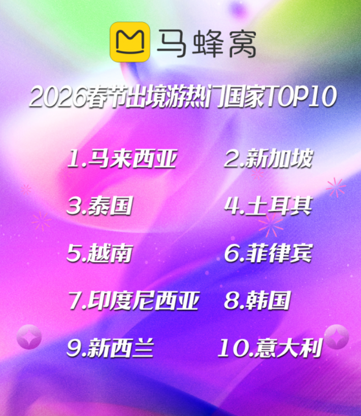超长假期同样带动了出境长线游热度增长。马蜂窝数据显示,春节出境游热门国家前十为马来西亚、新加坡、泰国、土耳其、越南、菲律宾、印度尼西亚、韩国、新西兰、意大利。其中,意大利因米兰冬奥会举办时间与春节重合,吸引不少游客计划“观赛+旅行”,马蜂窝站内相关签证、租车攻略热度上涨170%。