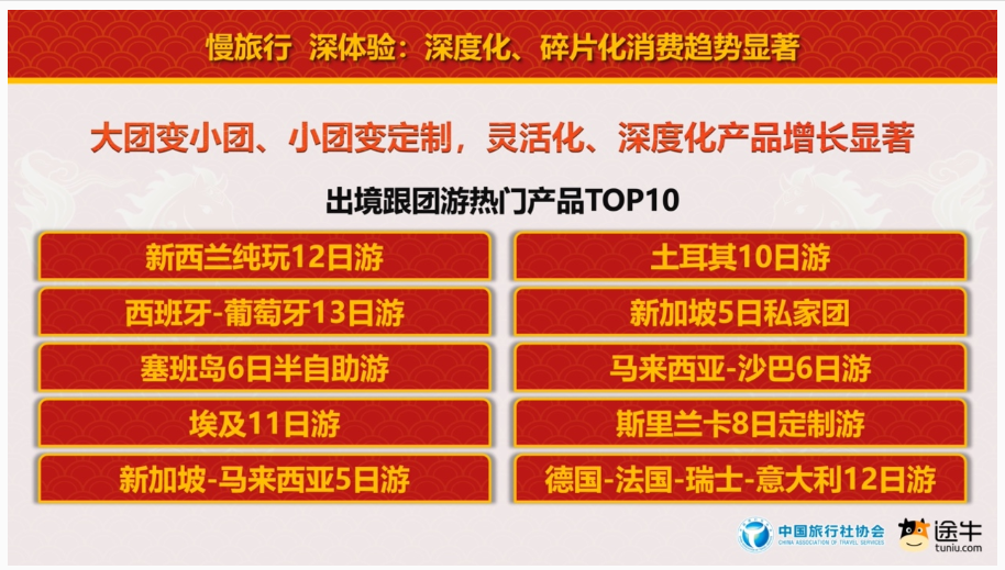 “新西兰纯玩12日游”“土耳其10日游”“西班牙-葡萄牙13日游”“新加坡5日私家团”“塞班岛6日半自助游”等深度游产品则是途牛用户出境跟团游的热门选择。